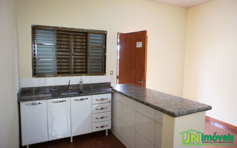 Kitnet para alugar no Centro com 1 quarto, sala, cozinha, banheiro, área de serviço e garagem coberta para 1 carro.