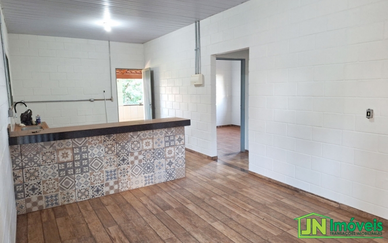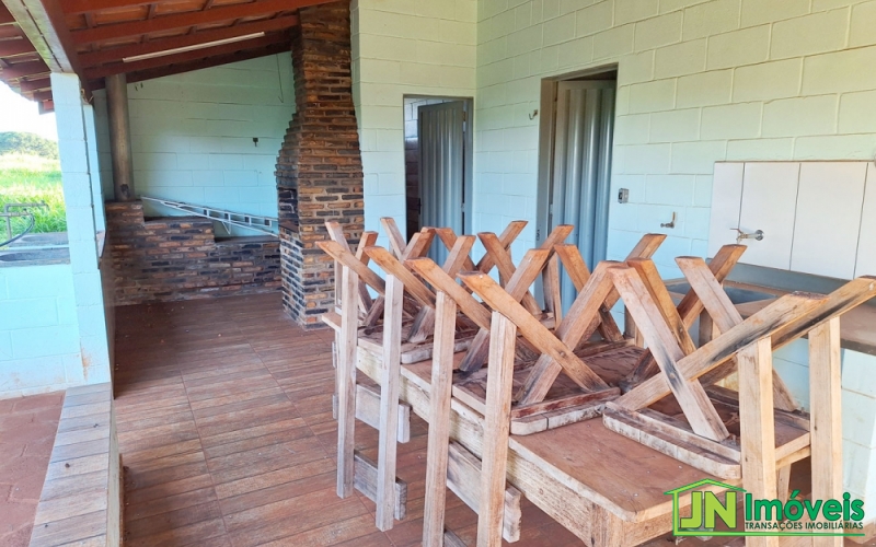Rancho para alugar na saída do Bairro Caiapó, com 2 quartos, sala, cozinha, 2 banheiros, área de serviço, área gourmet com churrasqueira e forno à lenha e garagem coberta para 2 carros.